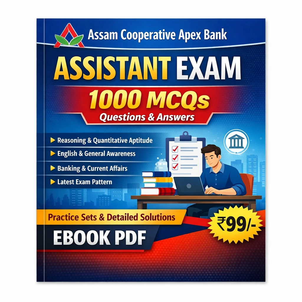 This Assam Cooperative Apex Bank Assistant Exam PDF Book in English contains 1000+ multiple choice questions (MCQs), practice sets, and detailed answers, specially prepared for candidates appearing in the Assam Cooperative Apex Bank Assistant Recruitment Examination 2025–26.