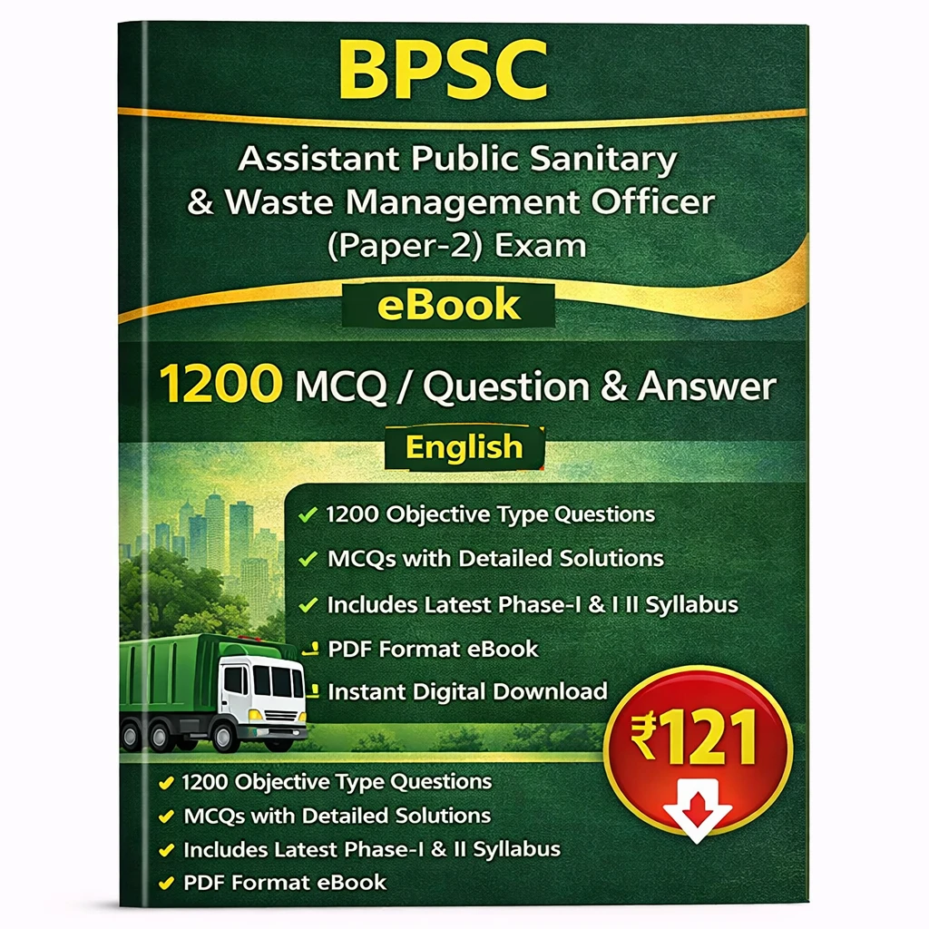 This BPSC Assistant Public Sanitary & Waste Management Officer (Paper-2) Exam PDF Book in English contains 1200 MCQs, practice questions, question answers, and comprehensive subject-wise notes, specially prepared for candidates appearing in the BPSC Sanitary & Waste Management Officer Examination 2025–26.