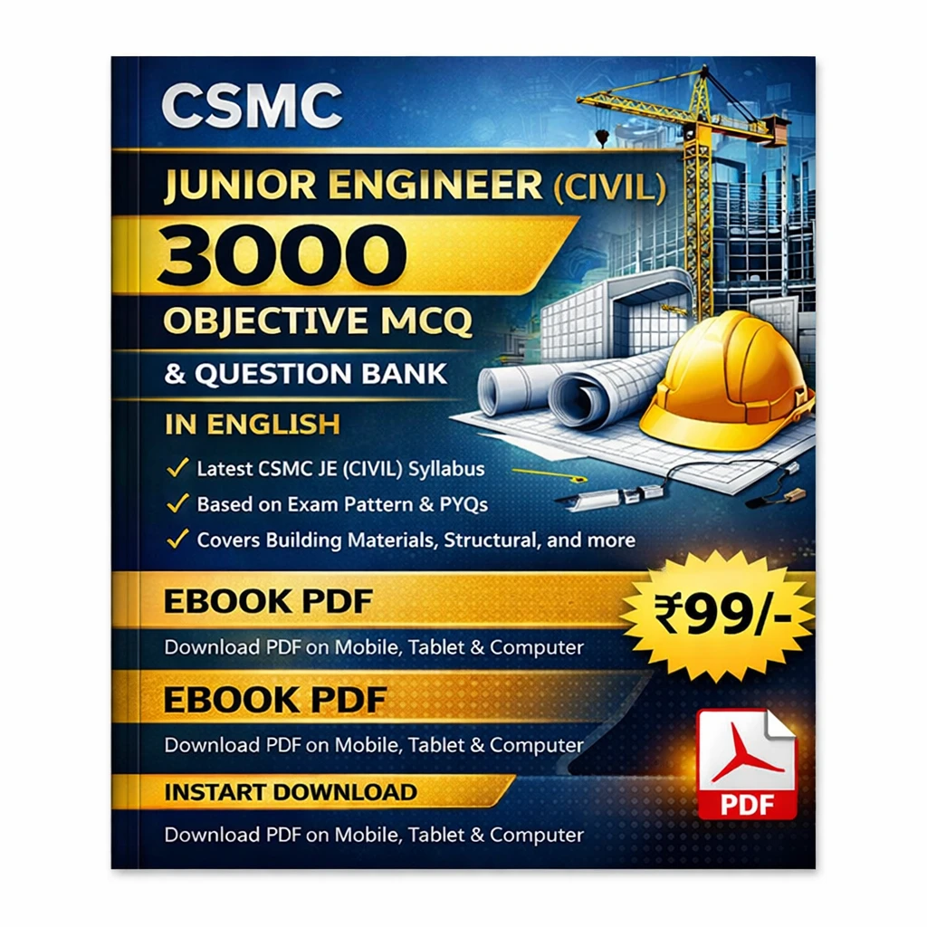 This CSMC Junior Engineer (Civil) Exam PDF Book in English contains 3000+ objective multiple choice questions (MCQs), practice sets, and detailed answers, specially prepared for candidates appearing in the CSMC Junior Engineer Civil Recruitment Examination 2025–26.
