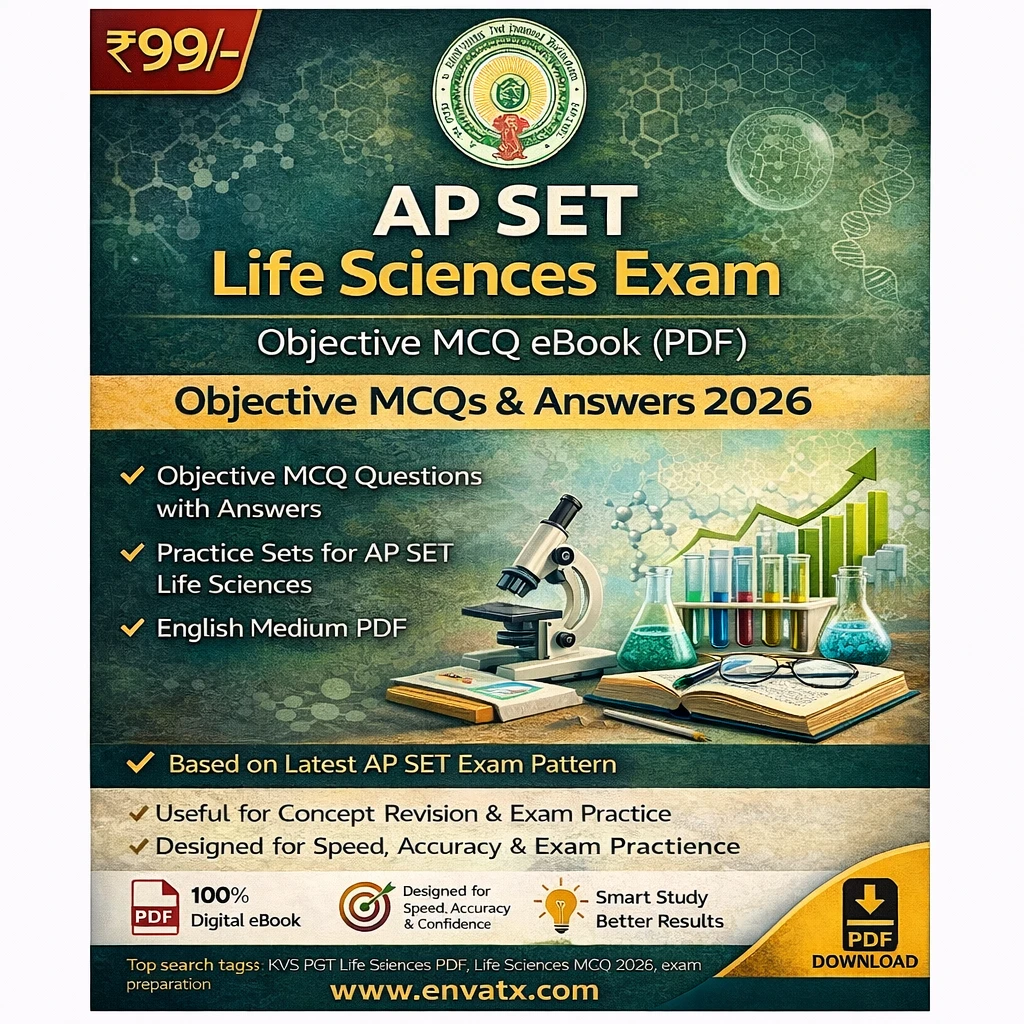 This AP SET Life Sciences Exam PDF Book in English contains objective MCQ questions with answers, practice sets, and exam-oriented study material, specially prepared for candidates appearing in the AP SET Life Sciences Examination 2026.