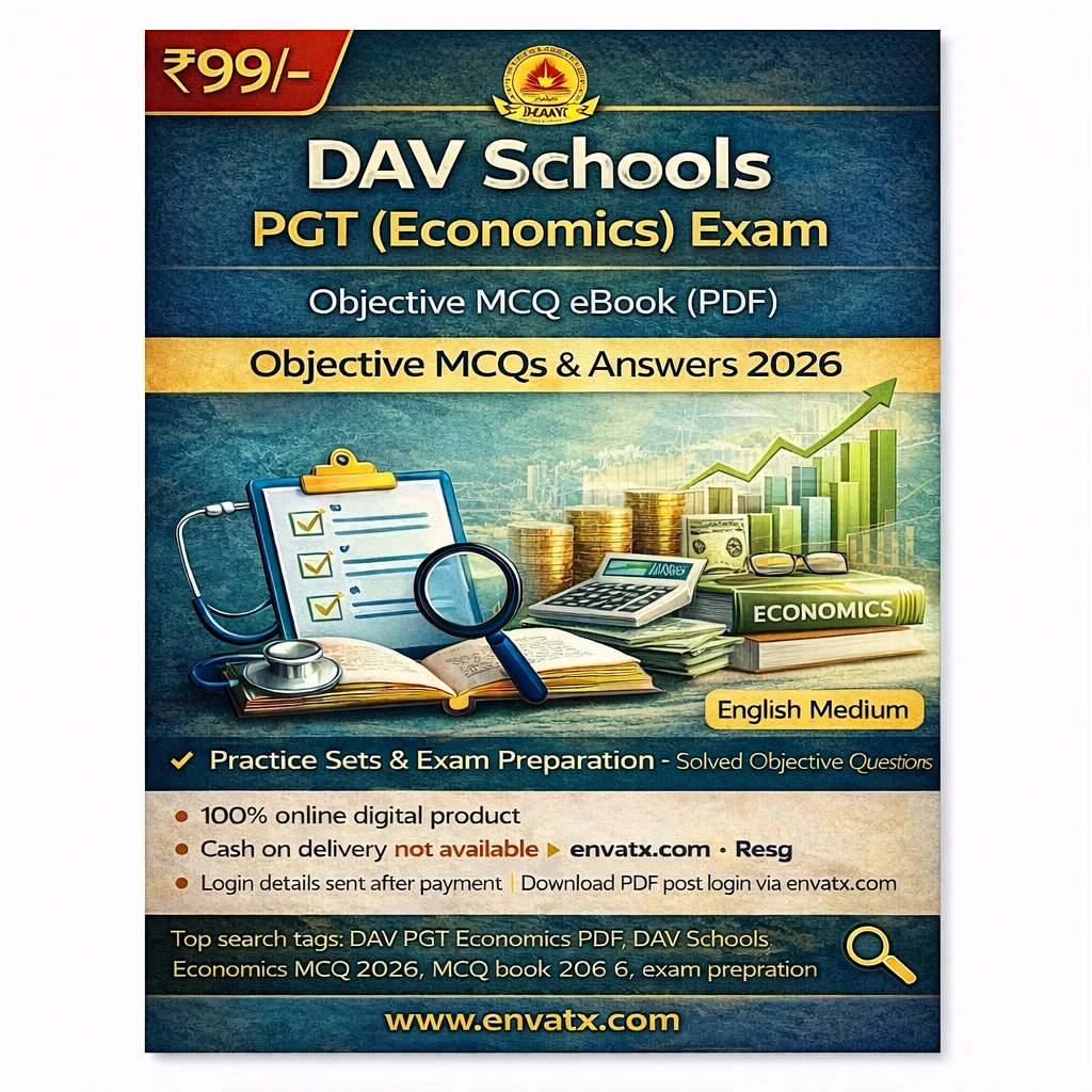 This DAV Schools PGT (Economics) Exam PDF Book in English contains objective MCQ questions with answers, practice sets, and exam-oriented study material, specially prepared for candidates appearing in the DAV Schools PGT Economics Examination 2026.