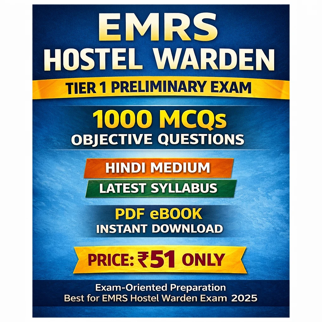 This EMRS Hostel Warden Tier 1 Preliminary Exam PDF Book in Hindi contains 1000 MCQs (Objective Questions with Answers), specially designed for candidates preparing for the EMRS Hostel Warden recruitment examination.