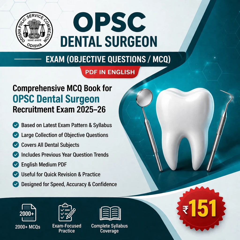 This OPSC Dental Surgeon Exam Objective Questions (MCQ) PDF Book in English contains a comprehensive collection of multiple choice questions, practice questions, MCQs, and exam-oriented study material, specially prepared for candidates appearing in the OPSC Dental Surgeon Examination 2025–26.