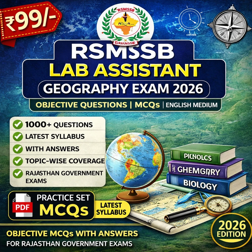 This RSMSSB Lab Assistant Geography Exam eBook PDF in English contains objective questions, MCQs, and comprehensive study material, specially prepared for candidates appearing in the RSMSSB Lab Assistant Examination 2025–26.