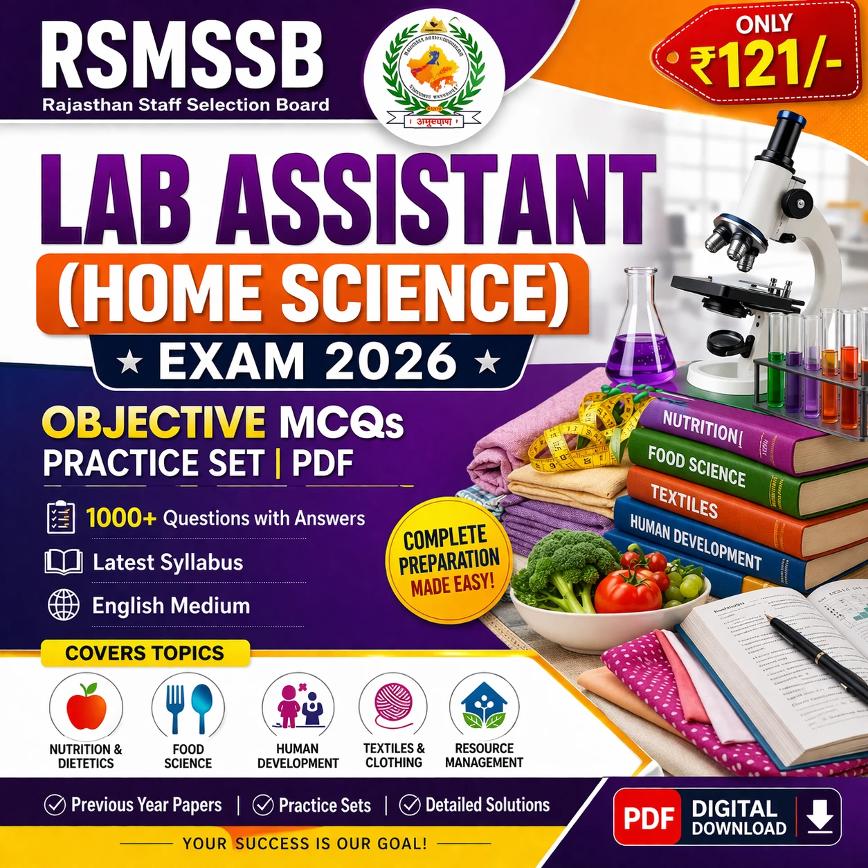 This RSMSSB Lab Assistant (Home Science) Exam eBook in English contains Previous Year Question Papers (PYQs), practice questions, MCQs, and comprehensive Home Science notes, specially prepared for candidates appearing in the RSMSSB Lab Assistant Examination 2025–26.