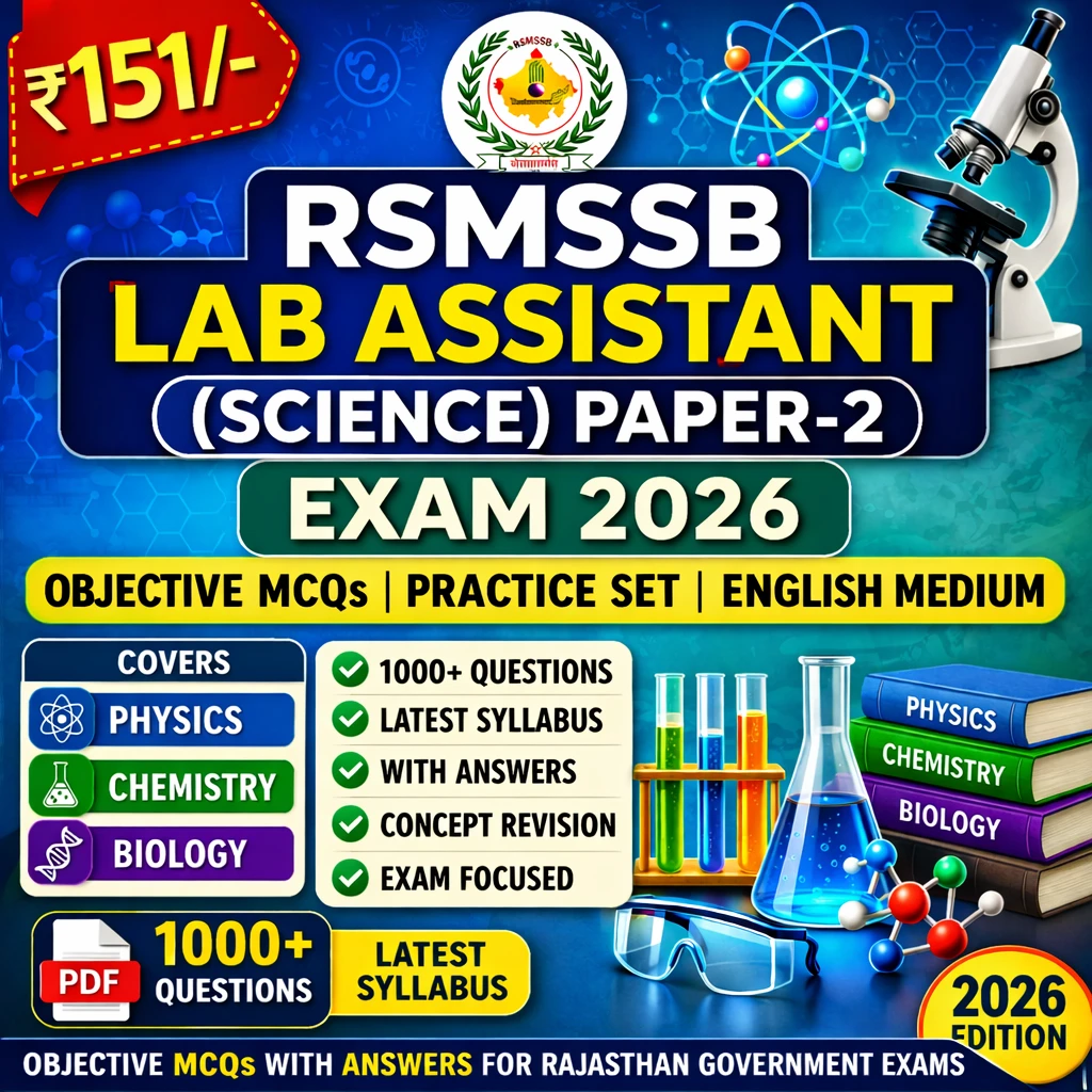 This RSMSSB Lab Assistant Science Paper 2 Exam eBook in English contains Previous Year Question Papers (PYQs), practice questions, MCQs, and comprehensive science notes, specially prepared for candidates appearing in the RSMSSB Lab Assistant Examination 2025–26.