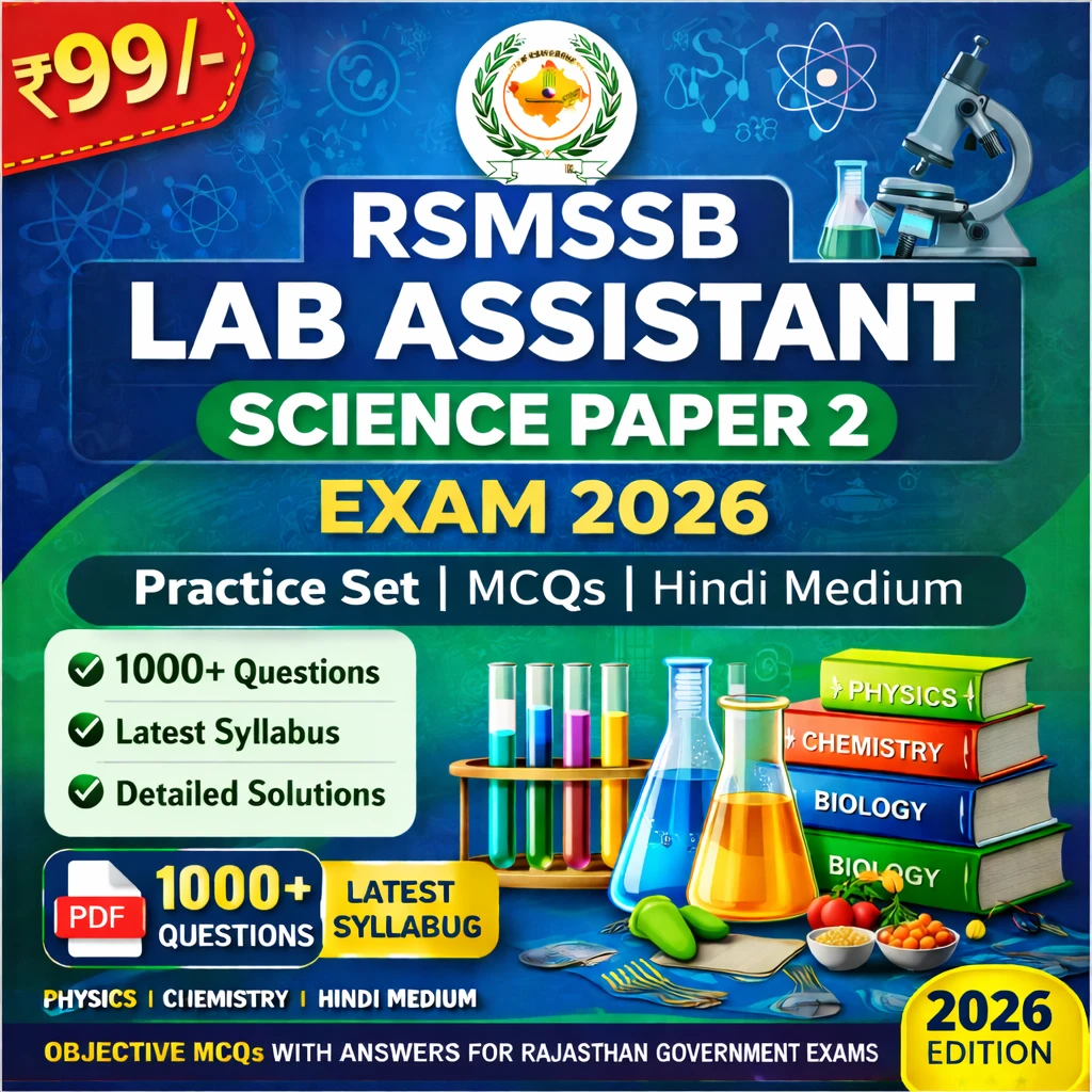 The content is strictly based on the latest RSMSSB Lab Assistant syllabus and exam pattern, with questions and study material compiled from previous Rajasthan recruitment examinations, making it highly effective for exam-oriented practice, systematic revision, and concept strengthening.
