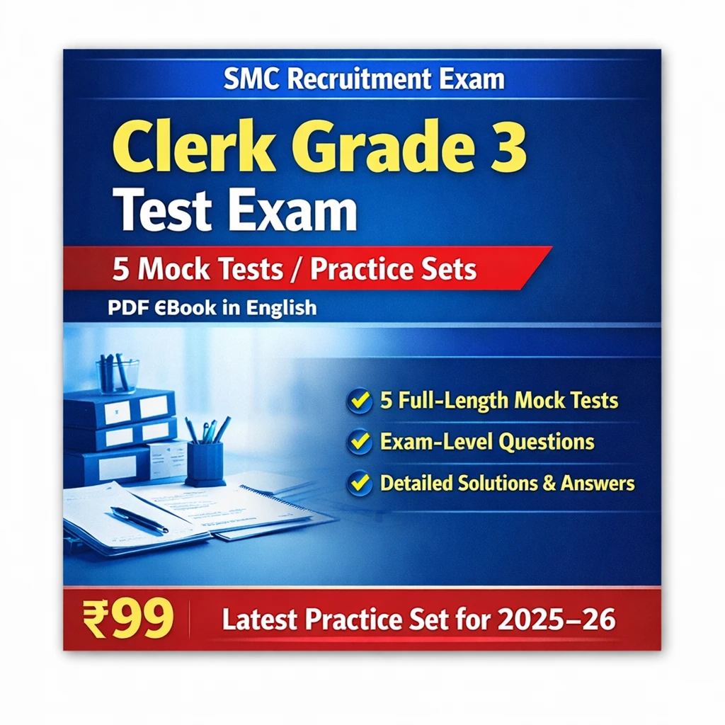 This SMC Clerk Grade 3 Exam PDF Book in English contains 5 full-length mock tests, practice questions, and detailed answers, specially prepared for candidates appearing in the SMC Clerk Grade 3 Recruitment Examination 2025–26.