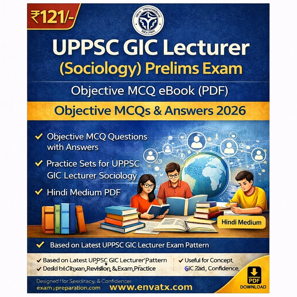 This UPPSC GIC Lecturer (Sociology) Prelims Exam PDF Book in Hindi contains objective MCQ questions with answers, practice sets, and exam-oriented study material, specially prepared for candidates appearing in the UPPSC GIC Lecturer Sociology Prelims Examination 2026.