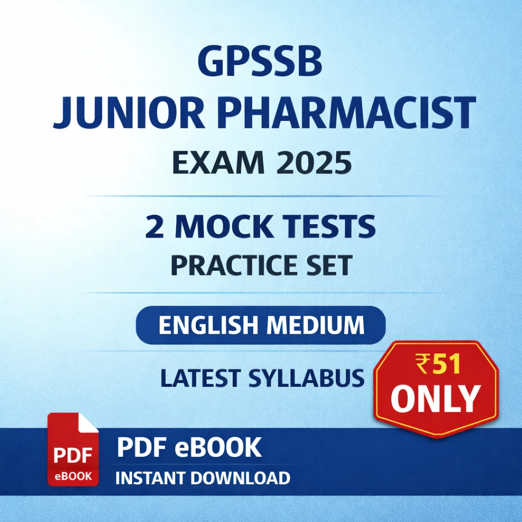 This GPSSB Junior Pharmacist Exam PDF Book in English contains 2 mock tests / practice sets, carefully prepared for candidates appearing in the GPSSB Junior Pharmacist examination 2025.