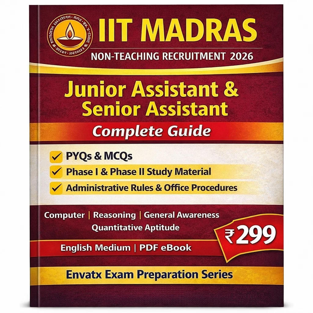 This IIT Madras Non-Teaching Recruitment Junior Assistant & Senior Assistant Exam 2026 PDF Book in English contains Previous Year Question Papers (PYQs), practice questions, MCQs, and comprehensive administrative notes, specially prepared for candidates appearing in the IIT Non-Teaching Recruitment Examination 2026.