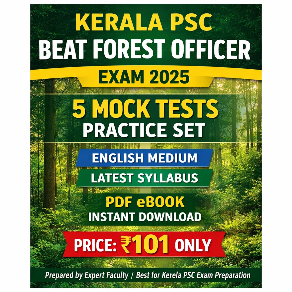 This Kerala PSC Beat Forest Officer Test Exam PDF Book in English contains 5 full-length mock tests and practice sets, prepared strictly according to the latest Kerala PSC syllabus and exam pattern (2025).