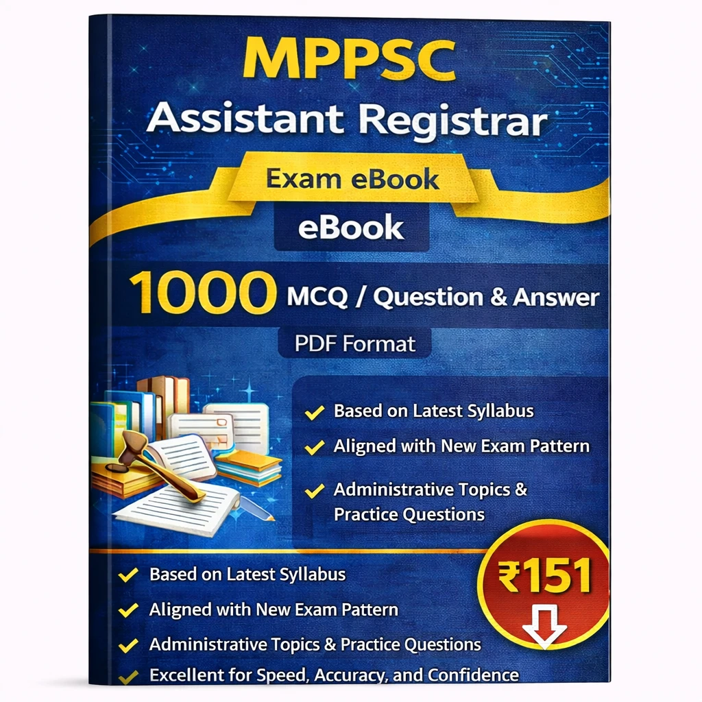 This MPPSC Assistant Registrar Exam PDF Book in Hindi contains 1000 MCQs, practice questions, question answers, and comprehensive subject-wise notes, specially prepared for candidates appearing in the MPPSC Assistant Registrar Examination 2025–26.