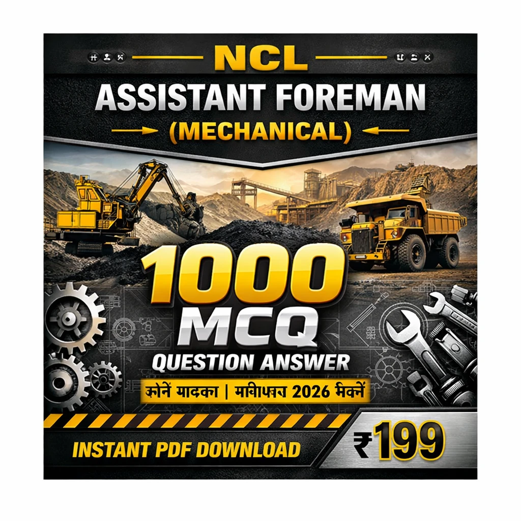 This NCL Assistant Foreman (Mechanical) Exam 2026 PDF Book in Hindi contains 1000+ important MCQs, practice questions, previous year questions, and detailed answers specially prepared for candidates appearing in the Northern Coalfields Limited Assistant Foreman Mechanical Recruitment Examination.
