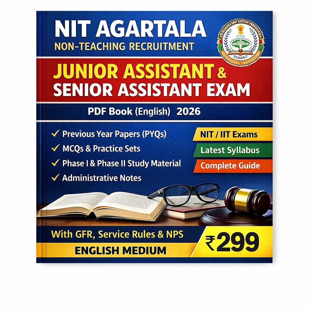 This NIT Agartala Non-Teaching Recruitment Junior Assistant & Senior Assistant Exam PDF Book in English contains Previous Year Question Papers (PYQs), practice questions, MCQs, and comprehensive administrative notes, specially prepared for candidates appearing in the National Institute of Technology Agartala Non-Teaching Recruitment Examination 2025–26.