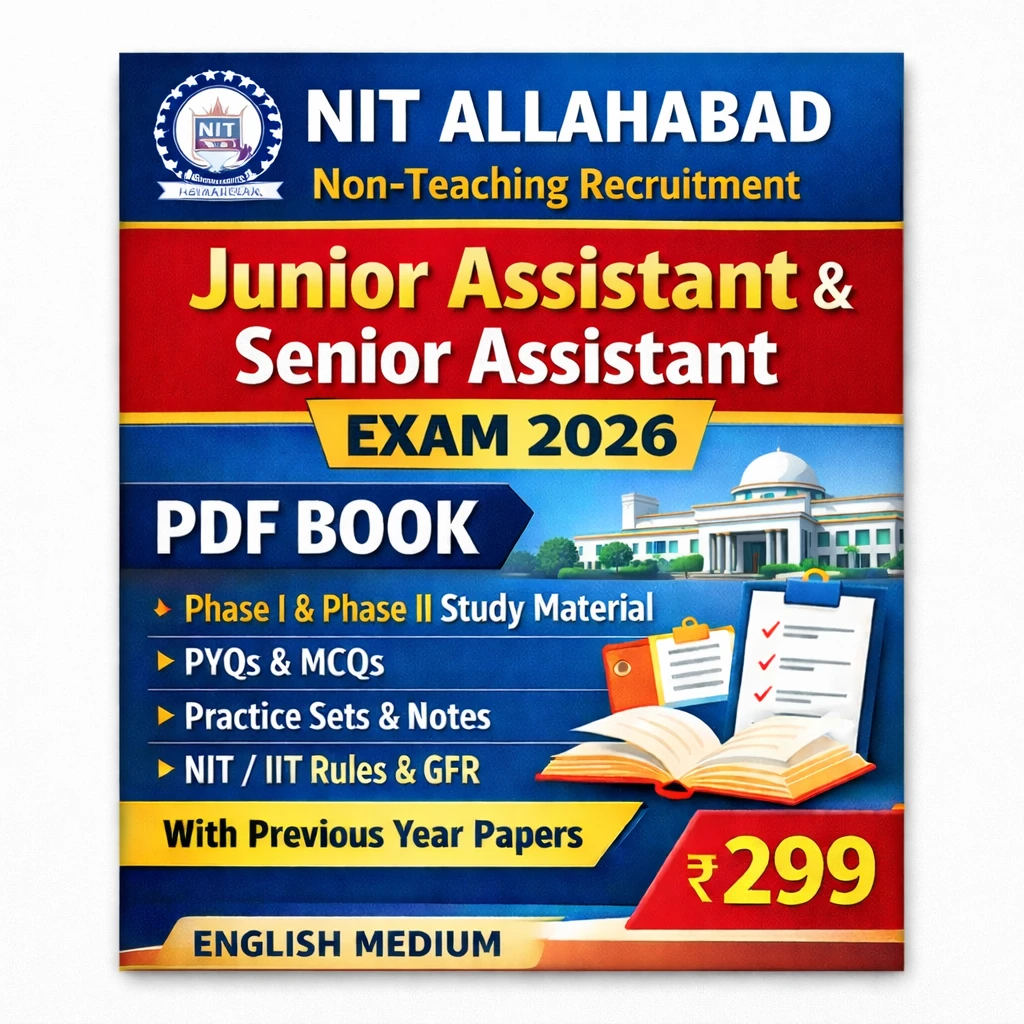 This NIT Allahabad Non-Teaching Recruitment Junior Assistant & Senior Assistant Exam PDF Book in English contains Previous Year Question Papers (PYQs), practice questions, MCQs, and comprehensive administrative notes, specially prepared for candidates appearing in the NIT Allahabad Non-Teaching Recruitment Examination 2025–26.