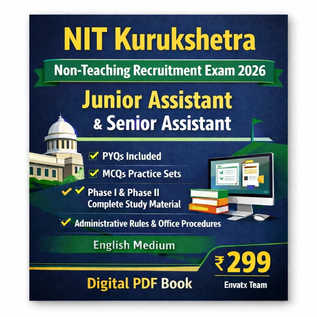 This NIT Kurukshetra Non-Teaching Recruitment Junior Assistant & Senior Assistant Exam PDF Book in English contains Previous Year Question Papers (PYQs), practice questions, MCQs, and comprehensive administrative notes, specially prepared for candidates appearing in the NIT Kurukshetra Non-Teaching Recruitment Examination 2026.
