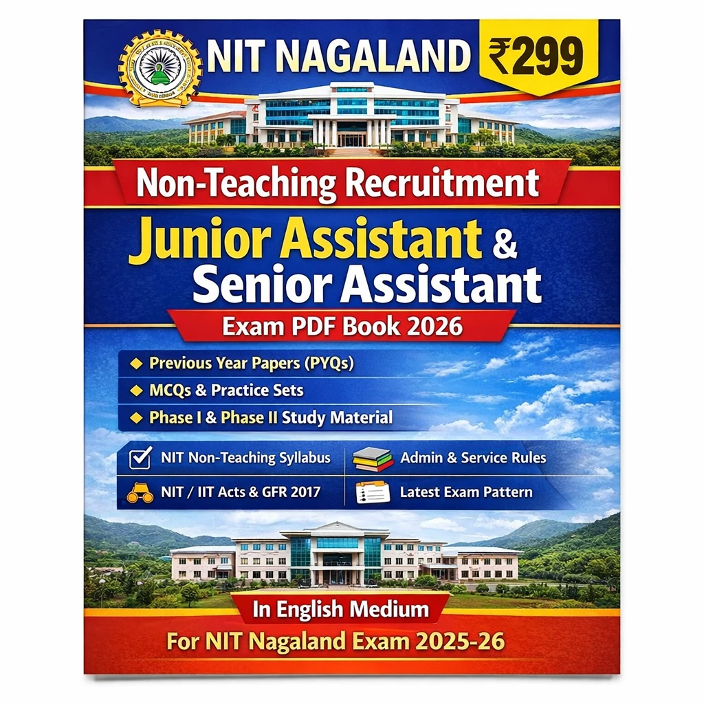 This NIT Nagaland Non-Teaching Recruitment Junior Assistant & Senior Assistant Exam PDF Book in English contains Previous Year Question Papers (PYQs), practice questions, MCQs, and comprehensive administrative notes, specially prepared for candidates appearing in the NIT Nagaland Non-Teaching Recruitment Examination 2026.