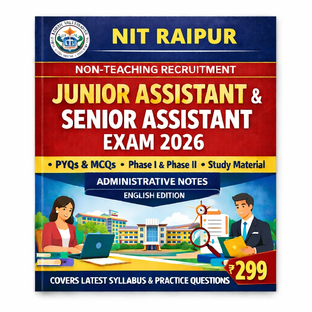 This National Institute of Technology Raipur Non-Teaching Recruitment Junior Assistant & Senior Assistant Exam PDF Book in English contains Previous Year Question Papers (PYQs), practice questions, MCQs, and comprehensive administrative notes, specially prepared for candidates appearing in the NIT Raipur Non-Teaching Recruitment Examination 2025–26.