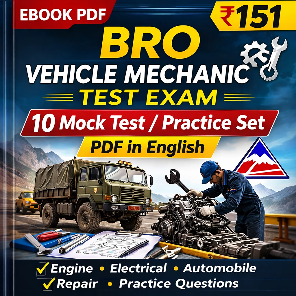 This BRO Vehicle Mechanic Test Exam 2026 PDF Book in English contains mock test papers, practice questions, MCQs, and comprehensive exam-oriented study material specially prepared for candidates appearing in the Border Roads Organisation Vehicle Mechanic Recruitment Examination.