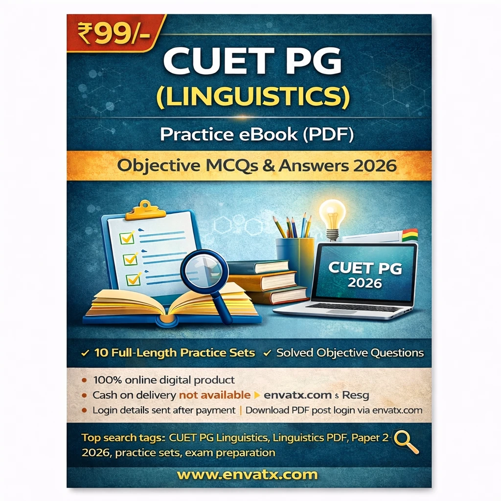 This CUET PG (Linguistics) Exam PDF Book in English contains objective MCQ questions with answers, practice sets, and exam-oriented study material, specially prepared for candidates appearing in the CUET PG Linguistics Examination 2026.