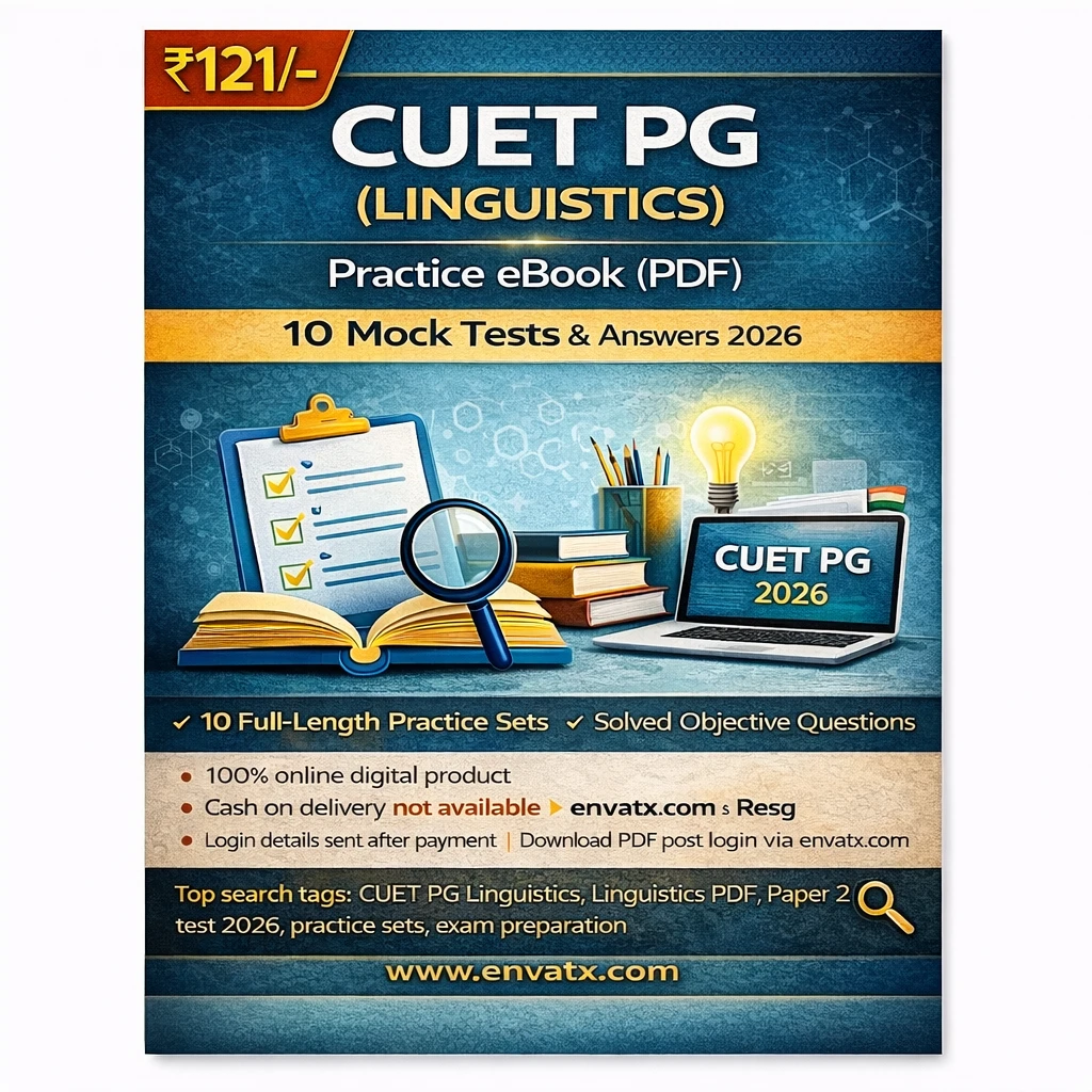 This CUET PG Linguistics Exam PDF Book in English contains practice sets, objective MCQ questions with answers, and exam-oriented study material, specially prepared for candidates appearing in the CUET PG Linguistics Examination 2026.