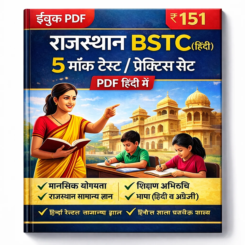 This Rajasthan BSTC Pre D.El.Ed Exam 2026 PDF Book in Hindi contains mock test papers, practice questions, MCQs, and exam-oriented study material specially prepared for candidates appearing in the Rajasthan BSTC Entrance Examination.