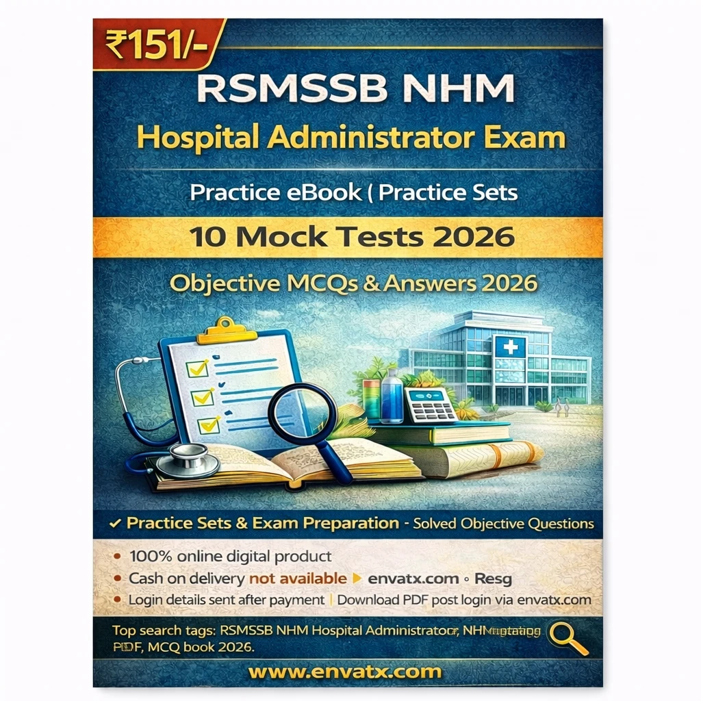 This RSMSSB NHM Hospital Administrator Exam PDF Book in English contains practice sets, objective MCQ questions with answers, and exam-oriented study material, specially prepared for candidates appearing in the RSMSSB NHM Hospital Administrator Examination 2026.